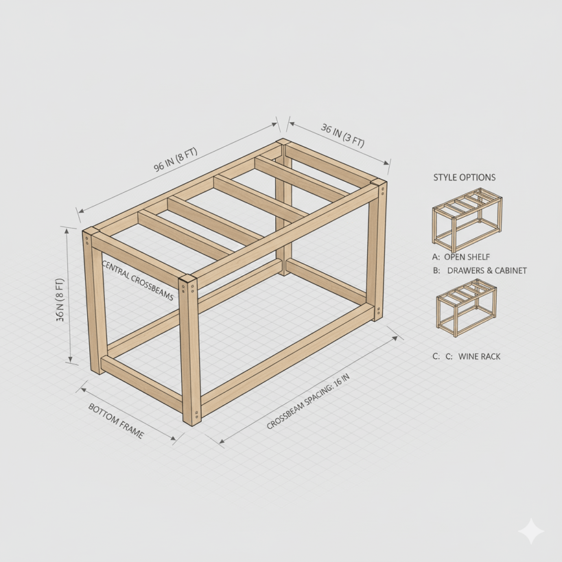 Once you’ve nailed down the style, think about how to actually build it so it lasts. Decide how many supports and crossbeams you’ll need. Too few, and the counter might wobble; too many, and it feels cluttered. Make sure everything’s balanced and sturdy. The goal is a frame that’s solid, safe, and won’t sag over time. A little planning here goes a long way trust me, it’s way easier to fix stuff on paper than once the wood’s all cut.
